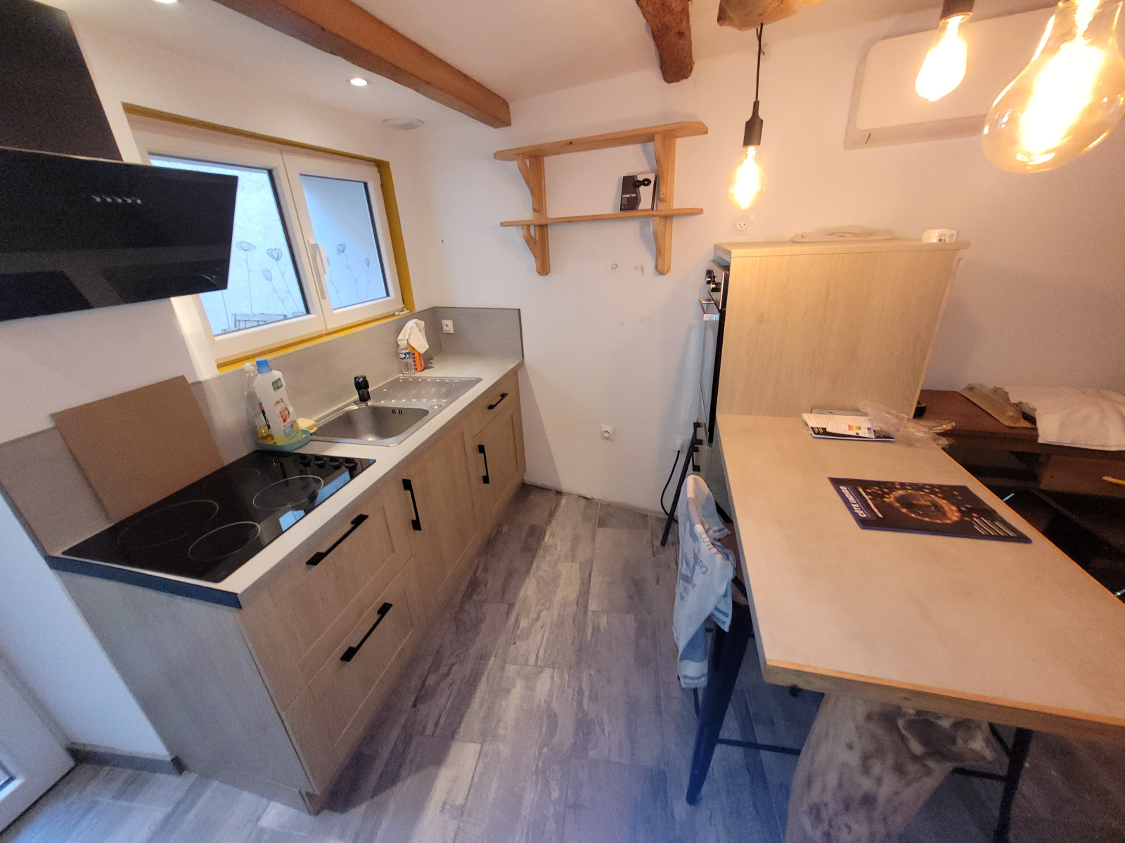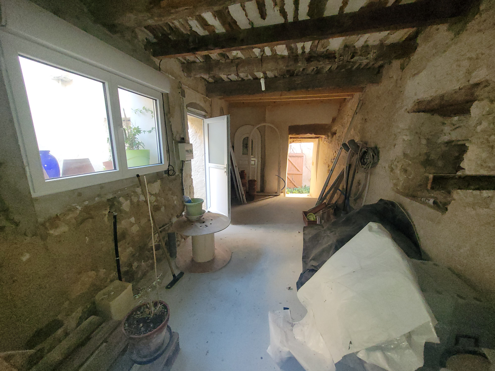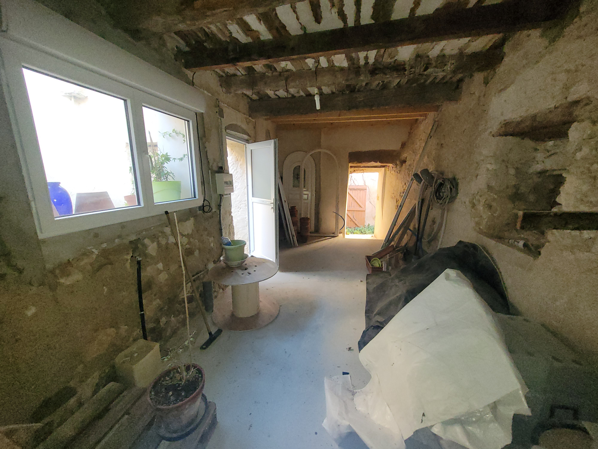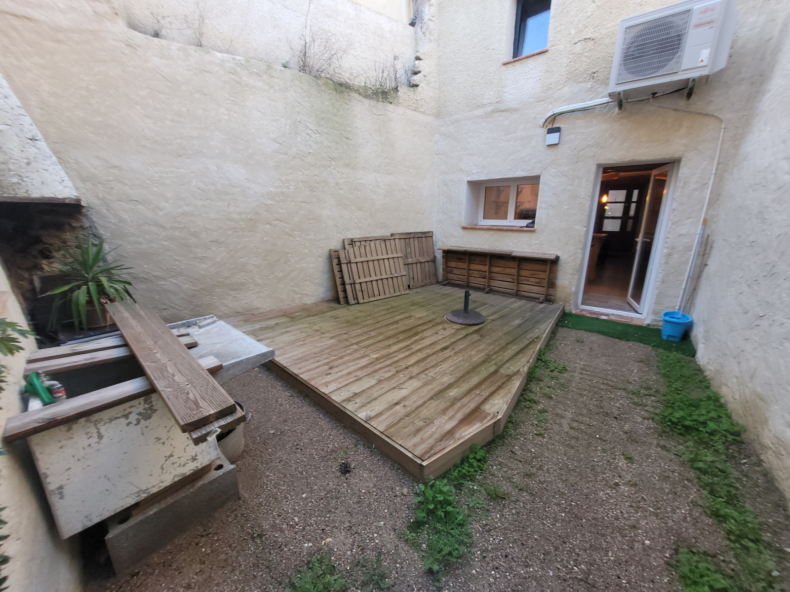 Composition : entrée sur pièce à vivre avec climatisation, coin cuisine aménagé et équipé avec une hotte, une plaque de cuisson et un four, porte fenetre donnant sur une cour intérieure, une remise et petit jardinet.